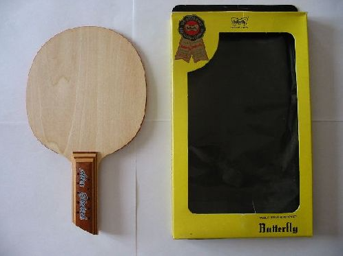 Bois Butterfly "Alex Ehrlich", avec sa boîte, palette 5 plis avec un pli central épais et une bande de protection rouge sur la tranche, manche caractéristique du modèle : droit, avec 2 rangées de 5 trous de chaque côté, et le bas biseauté, sticker "Alex Ehrlich" sur un côté, sticker "Butterfly" sous le manche. Présenté ici avec sa boîte. Années 70/80. Ce modèle est plus récent que le modèle Stiga des années 60, beaucoup plus rare.