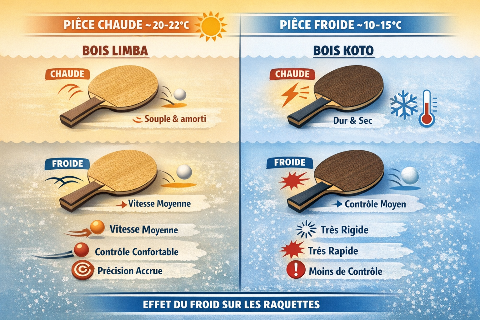 Mettre une raquette de tennis de table avec un bois Limba dans une pièce froide peut avoir un effet subtil mais réel sur le comportement de la raquette. Voici les points principaux :