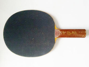 Raquette modèle "Aguilar", revêtements bleus à picots courts sans mousse, bois 3 plis, manche droit, inscription "Fr. Aguilar" gravé en doré d'un côté du manche. Années 40/50. François Aguilar était un joueur français sélectionné en équipe de France pour les Championnats du Monde à Wembley en 1938. Photo : raquettes collection blog4ever