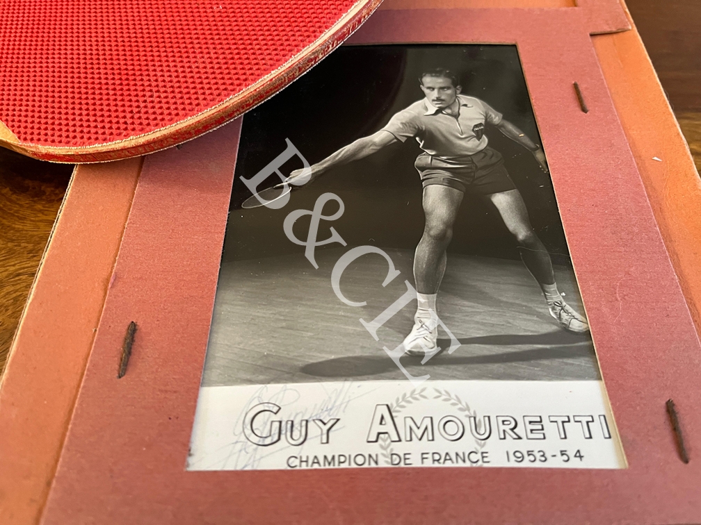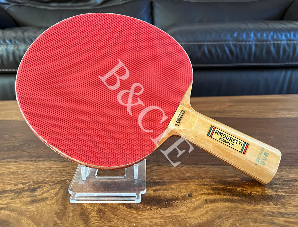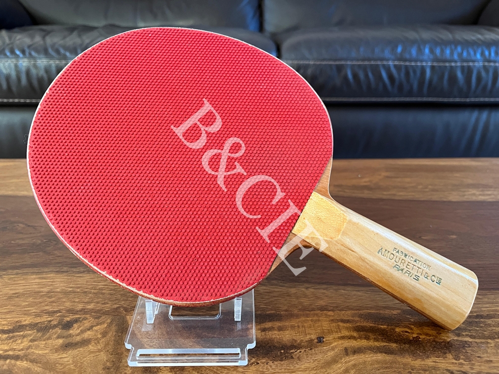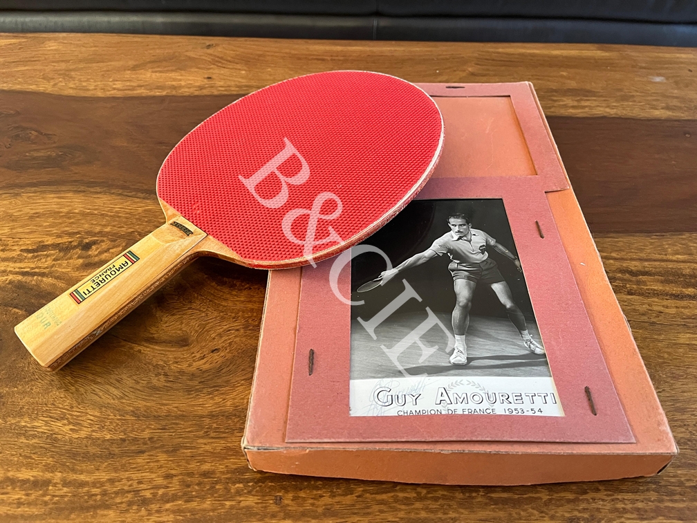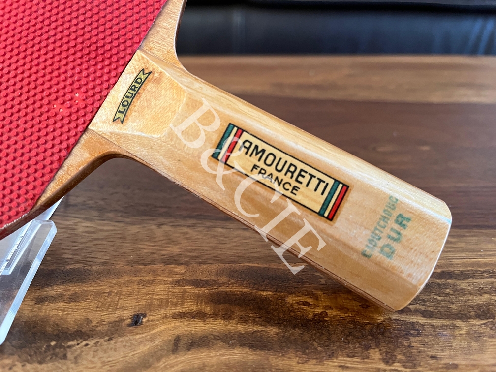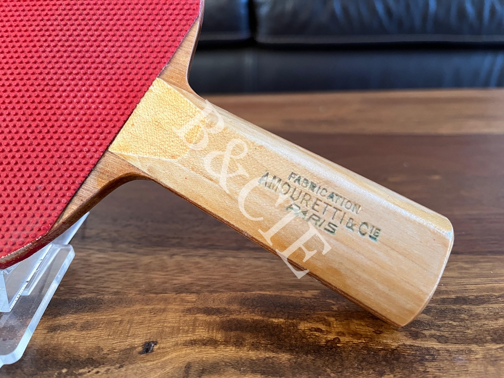 Raquette de marque Amouretti (France), revêtements rouges à picots courts sans mousse, bois 5 plis avec pli central épais, manche conique de section octogonale, sticker "FABRICATION AMOURETTI Cie PARIS - AMOURETTI FRANCE - LOURD DUR" d'un côté du manche. Années 50/60.