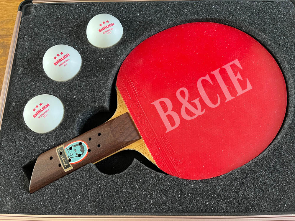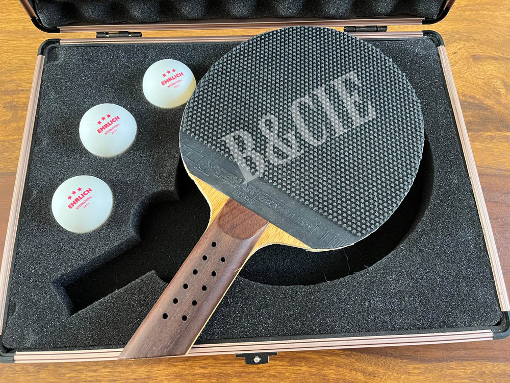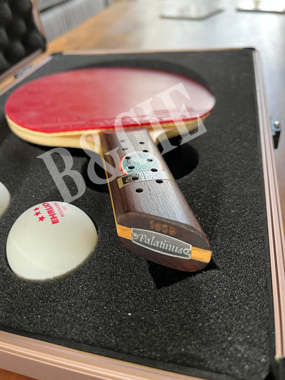 Ce bois réalisé par le hongrois Robert Palatinus, reprend fidèlement les mêmes placages et le même procédé de collage que l’Ehrlich original. Il est en plus renforcé de deux couches de carbone souple au-dessus du noyau, offrant une stabilité accrue face aux balles plastiques, tout en conservant un contrôle précis et une excellente qualité de rotation.