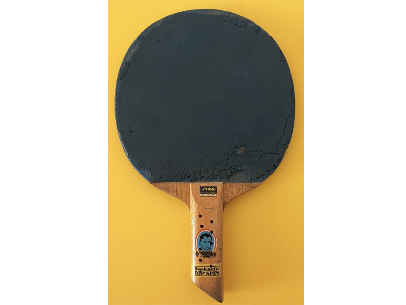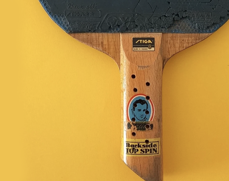 Raquette Stiga des années 60/70 équipée de deux revêtements backside verts Yasaka Stiga 2 étoiles, associée au célèbre bois Ehrlich. Celui-ci se distingue par son manche droit biseauté, percé de 11 trous de chaque côté, une palette en 5 plis avec un pli central épais, et le sticker « Ehrlich ».