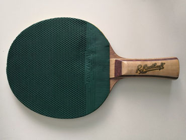 Raquette modèle R. Roothooft, revêtements verts "Sun Lucky" (Japon) à picots courts avec mousse jaune, bois 5 plis, manche concave, sticker "R. Roothooft" d'un côté du manche, sticker "CHAMPION DE FRANCE 1952 - 1953 - 1957" sur le côté du manche, sticker "PECHE.SPORT.CAMPING MILMAIL 191, RUE DE TOLBIAC PARIS 13ème GOB: 1262" sous le manche, du magasin qui a vendu la raquette. Années 60/70. Photo : raquettes collection blog4ever